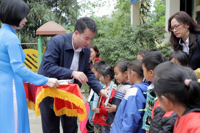 Tổng Giám đốc Bảo hiểm xã hội Việt Nam Nguyễn Thế Mạnh tặng thẻ bảo hiểm y tế cho học sinh tại tỉnh Điện Biên.