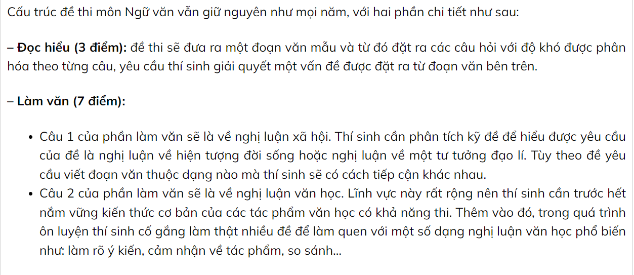 Cấu trúc đề thi môn Ngữ văn