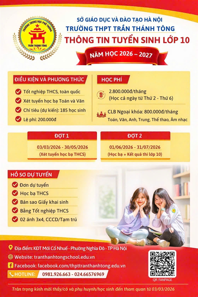 - Đợt 2: Từ ngày 01/06/2026 đến ngày 31/07/2026 theo phương thức kết hợp cả xét tuyển học bạ THCS và Kết quả thi kỳ thi tuyển sinh lớp 10 năm 2026 do Sở GD&ĐT Hà Nội tổ chức.