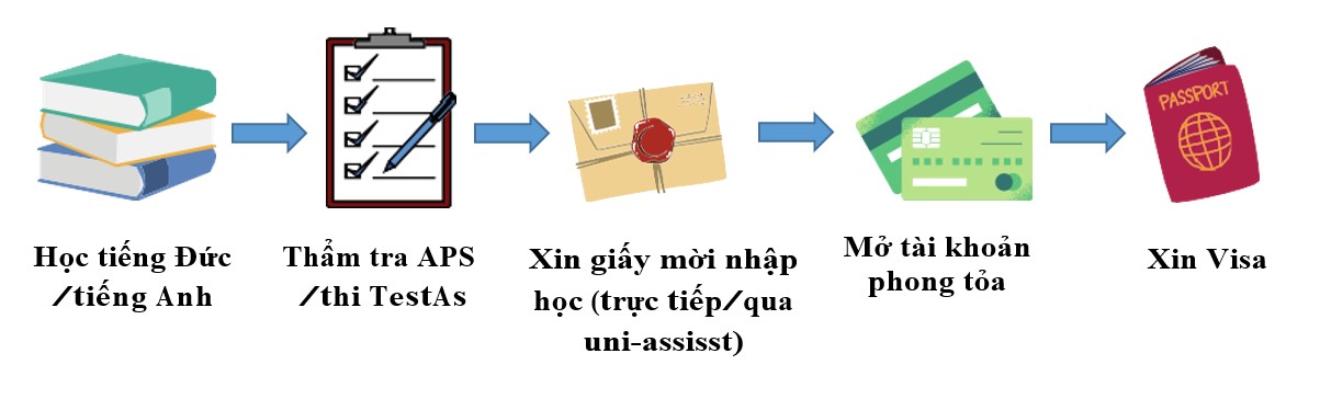 Sau khi nhận được giấy báo nhập học, các bạn sẽ cần mở tài khoản phong tỏa để chứng minh tài chính. Số tiền được ĐSQ Đức yêu cầu tính đến thời điểm 2021 là 10.332 EUR/ năm (12 tháng), tài khoản phong tỏa được nộp tại Deutsche Bank hoặc Viettinbank.